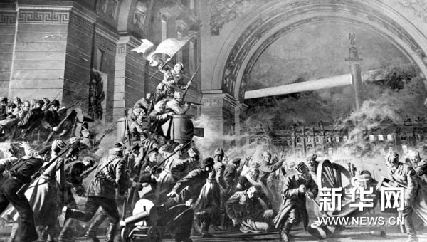 1917年11月7日,是十月社会主义革命纪念日。这一天,在列宁的领导下,俄国彼得格勒工人和士兵举行起义,组成以列宁为首的第一个工农苏维埃政府。十月社会主义革命为全世界无产阶级和民族解放运动开辟了新的道路。这幅图画展示的是1917年11月7日下午,冬宫被包围。“阿芙乐尔”巡洋舰的炮声一响,成千上万的革命战士开始攻打冬宫。 新华社发