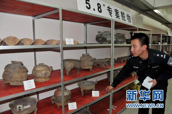 11月5日,湖北随州警方一名民警在临时库房里清点追缴的文物。湖北省随州市“5·8”特大盗掘古墓、倒卖文物专案近日成功告破。警方目前已抓获犯罪嫌疑人32名,追回文物198件。 新华社记者 万后德 摄