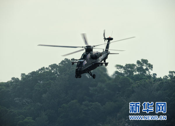 11月11日,国产武直10武装直升机在珠海三灶机场进行飞行训练。当日,我国自主研制生产的武直10武装直升机在珠海三灶机场进行了约20分钟的适应性飞行训练,做出倒飞、莱维斯曼机动、高速大角度俯冲、低空小半径盘旋等动作,展现出其优异性能,引来航展现场观众频频喝彩。新华社记者 杨光 摄