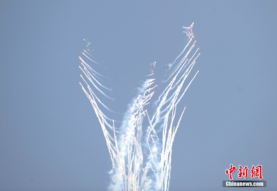 12日下午两点整,俄罗斯勇士飞行表演队5架表演机准时启动进行飞行表演,展示了“加力盘旋”、“跃升半滚倒转”、“向上开花”、“双机对冲”等精彩动作,为观众提供了一场视觉盛宴,体现了苏27优异的机动性能。