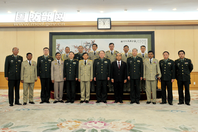 11月16日上午,国务委员兼国防部长梁光烈上将在八一大楼会见了来访的缅甸国防军副总司令兼陆军司令梭温上将一行并合影留念。 李晓伟