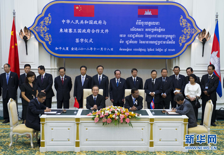 11月18日,中国国务院总理温家宝在金边与柬埔寨首相洪森共同出席两国政府经济技术合作协定等双边合作文件的签字仪式。 新华社记者王晔摄
