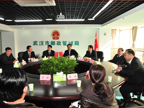 图为苏和副局长、刘立勇副市长等领导在武汉市邮政管理局调研。
