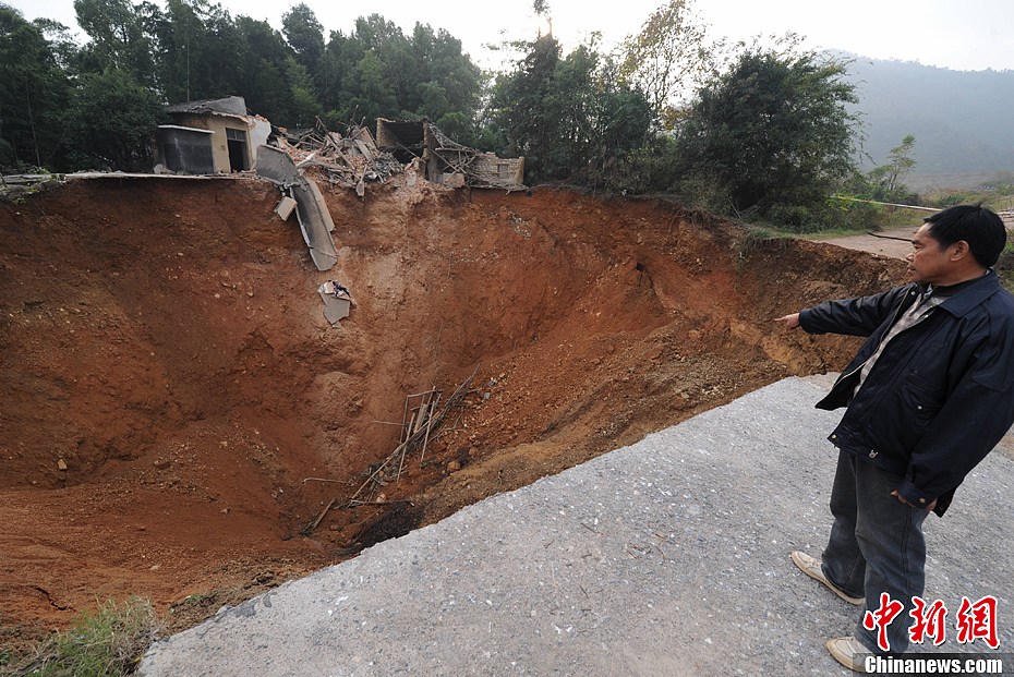 11月19日,湖南长沙岳麓区雨敞坪镇泉宏村的村民带领记者来到村内塌陷的大坑前。据泉宏村村民介绍,16日凌晨正值雨夜,当地村民发现了地面塌陷形成的大坑,坑洞且不断蔓延扩大。一天后,坑洞已将两层楼房“吞噬”。大坑面积约200平方米、深约30米,坑洞边留下房子的残骸。中新社发 杨华峰 摄