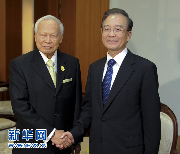 11月21日,国务院总理温家宝在曼谷会见泰国枢密院主席炳·廷素拉暖上将。 新华社记者 张铎 摄