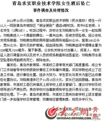 @青岛发布在微博中称:2012年10月27日晚,青岛求实职业技术学院(民办高校)师生一行11人一同到青岛市城阳区“粥全粥到”酒店4楼吃饭,其中6名老师、5名学生(2男3女)。吃饭过程中该校女生刘晓傲与另一女生一起如厕,刘晓傲进入一个靠窗的蹲位,一直未出来,后被发现坠楼。经公安机关现场勘查,刘晓傲如厕的厕所窗台距厕所地面60公分,窗高140公分、宽50公分,窗外无防护措施。经血液检测,刘晓傲血液中酒精含量为226毫克/100毫升,属于醉酒。公安机关综合对当事人、报案人、相关证人进行调查访问以及技术人员的现场勘查和法医鉴定,刘晓傲符合高空坠落致颅脑损伤死亡,排除他杀。
