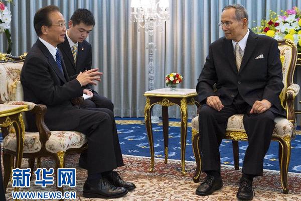 温家宝说,我访问泰国期间,真切感受到“中泰一家亲”,两国人民之间有着亲戚般情谊。普密蓬国王和泰国王室为推进中泰友好事业发挥了不可替代的重要作用,中方对此深表赞赏。我同英拉总理就双边关系深入交换了看法,达成新的重要共识。我相信在泰国王室关心和支持下,在两国各界的共同努力下,中泰全面战略合作伙伴关系一定会不断向前发展,更好造福两国人民。