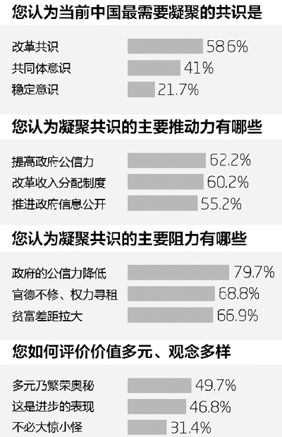 本报评论部:观察影响共识凝聚的原因,既有转型期价值多元带来的纷扰,也有贫富差距过大、公信力下降等原因。从您的观察研究看,当前应从哪里突破才有力、有效?