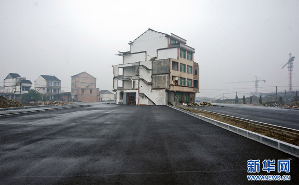 21日下午,位于浙江温岭火车站前未开通的大道上,四间楼房巍然矗立在路中间,其中两间还住着居民。尽管路还没有正式开通,但是有一些车辆经过,都得绕着房子通行。(图片来源:CFP 版权所有 请勿转载)