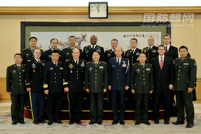 11月26日上午,副总参谋长戚建国中将在八一大楼会见了以斯蒂芬・里昂斯少将为团长的美军人道主义救援减灾代表团一行并合影留念。 李晓伟摄
