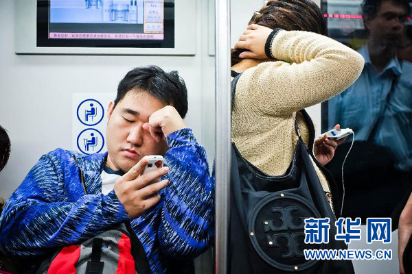 资料图片:10月12日,在北京地铁四号线列车上,两位乘客在查看手机。近年来,便携数字产品渐渐进入普通百姓的生活,成为人们,尤其是年轻人,在乘坐地铁等公共交通工具时获取信息和娱乐的主要方式。新华社发(张铖 摄)