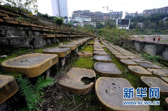 在重庆大田湾体育场内,看台上杂草丛生,座位破损不堪(11月27日摄)。 新华社记者 李健 摄