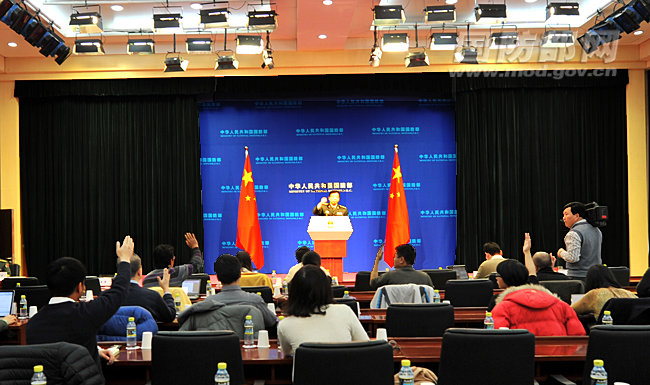 记者:歼-15成功着舰后,有媒体认为中国在领土和海洋权益争端上将更多展示肌肉,对外政策也将更趋强硬,可能会危及周边与中国有领土争端或者海洋权益争端的国家,请问对此作何评论?此外,有关歼-15的定型交付有无具体时间,可否透露一下。除了歼-15以外,“辽宁舰”接下来会进行哪些测试项目,会不会进行预警机或者空中加油机等一些测试项目?