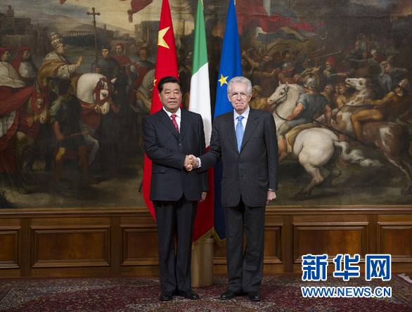 当地时间11月28日,全国政协主席贾庆林在罗马会见意大利总理蒙蒂。(来源:新华社记者 李学仁 摄)