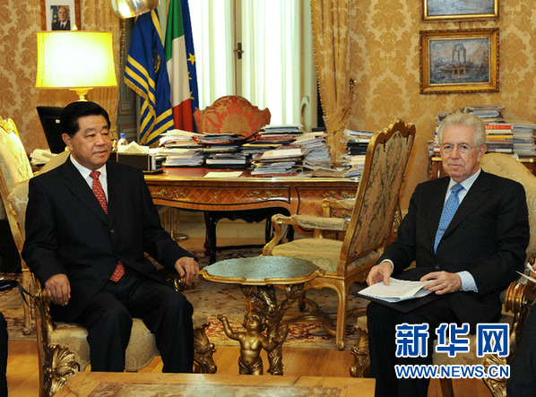 当地时间11月28日,全国政协主席贾庆林在罗马会见意大利总理蒙蒂。(来源:新华社记者 李学仁 摄)