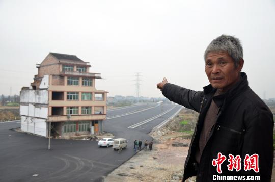 76岁的户主罗保根和他矗立在公路的最中间的民房 金云国 摄