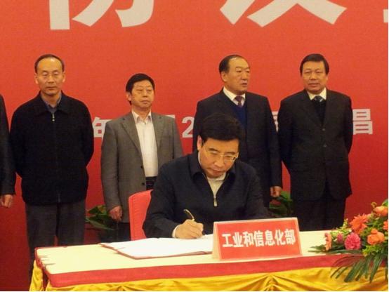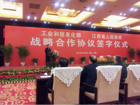 12月2日,工业和信息化部与江西省人民政府在南昌签署《关于推进江西省工业和信息化发展的战略合作框架协议》。工业和信息化部部长苗圩,江西省委书记苏荣、省长鹿心社、省委副书记尚勇、副省长洪礼和出席签约仪式。工业和信息化部办公厅、规划司、产业司等相关司局负责同志,以及江西省政府办公厅、工业和信息化委员会、发展改革委等有关部门负责同志参加签约仪式。签字仪式由洪礼和主持,苗圩和鹿心社代表双方在协议上签字。
