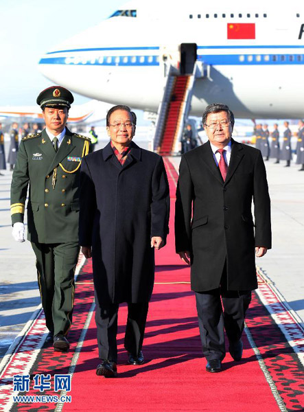 12月4日, 国务院总理温家宝抵达吉尔吉斯斯坦首都比什凯克,出席上海合作组织成员国总理第十一次会议并对吉尔吉斯斯坦进行正式访问。这是吉尔吉斯斯坦总理萨特巴尔季耶夫到机场迎接温家宝总理。 新华社记者 姚大伟 摄