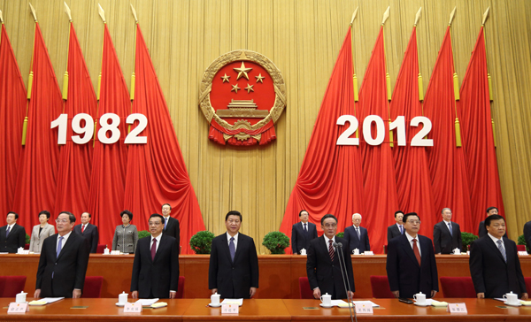 12月4日,首都各界在北京人民大会堂集会,隆重纪念现行宪法公布施行三十周年。习近平、吴邦国、李克强、张德江、俞正声、刘云山等出席大会。新华社记者兰红光摄