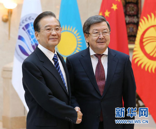 12月5日,上海合作组织成员国总理第十一次会议在吉尔吉斯斯坦首都比什凯克举行。中国国务院总理温家宝出席大、小范围会谈并发表讲话。这是吉尔吉斯斯坦总理萨特巴尔季耶夫会前迎接温家宝总理。 新华社记者 姚大伟 摄