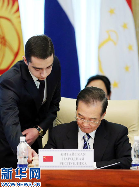 12月5日,上海合作组织成员国总理第十一次会议在吉尔吉斯斯坦首都比什凯克举行。中国国务院总理温家宝出席大、小范围会谈并发表讲话。这是温家宝出席相关文件签字仪式。 新华社记者 姚大伟 摄