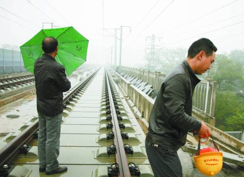 德清县乾元镇,两名施工方人员在宁杭高铁线路上巡查。