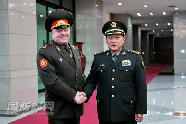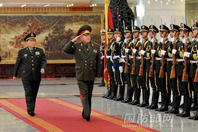 12月6日下午,国务委员兼国防部长梁光烈上将在八一大楼与来访的白俄罗斯国防部长扎多宾中将举行会谈。会谈前,梁光烈为扎多宾举行欢迎仪式,并陪同检阅了中国人民解放军三军仪仗队。 李晓伟摄
