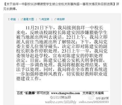 日前,一个名为“副校长乱摸门”的帖子在网上热传,帖子写道:“11月底,翁垟一中副校长陈某被抓走了,此人半夜到女生宿舍,趁学生熟睡时乱摸一气。第一次把女生摸醒了,吓得躲到床下。女生以为自己在做梦,于是又继续睡。此人过了一会又从床下爬出来继续摸……结果终于被女生抓个正着!事后女生家人认为不光彩,不打算声张。女生亲戚知道后帮女生报了案。”详细>>>