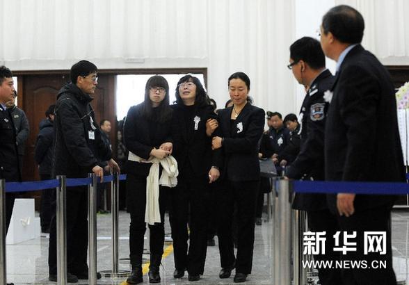 资料图片:11月29日,罗阳同志的妻子王希利(中)参加追悼会。当日上午10点,罗阳同志的追悼会在沈阳回龙岗殡仪馆举行。 新华社记者 李钢 摄
