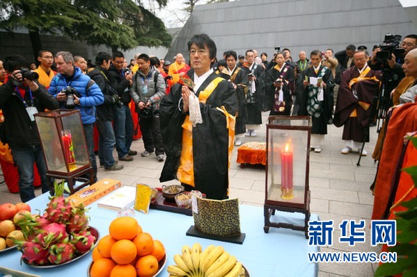 12月13日,日本佛教居士在南京大屠杀遇难同胞纪念馆内的“遇难者名单墙”前唱挽歌。当日上午8时许,中日两国约200位僧人、南京大屠杀幸存者及遇难者家属代表在南京举行国际和平法会,悼念侵华日军南京大屠杀同胞遇难75周年,并祈祷世界和平。新华社发