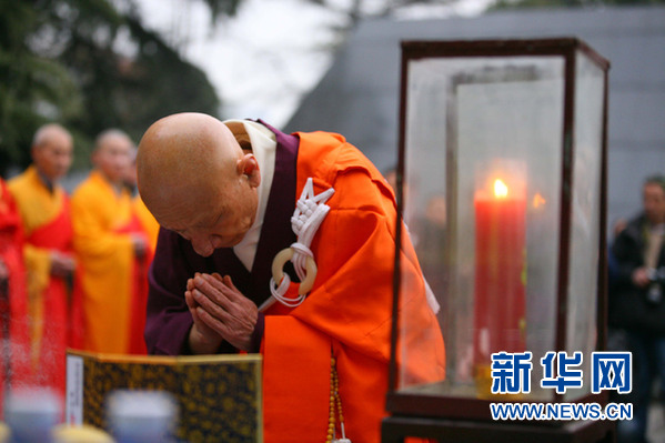 12月13日,日本僧人在南京大屠杀遇难同胞纪念馆内的“遇难者名单墙”前敬香祈祷。新华社发
