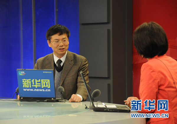 2012年12月13日,北京轨道交通建设管理有限公司总经理丁树奎做客新华网,与网友谈首都地铁建设。图为丁树奎与主持人交谈。新华网 朱冬 摄