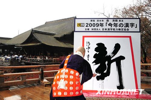 日本京都清水寺住持森清范挥毫写下日本2009年年度汉字“新”字。新华网华义摄