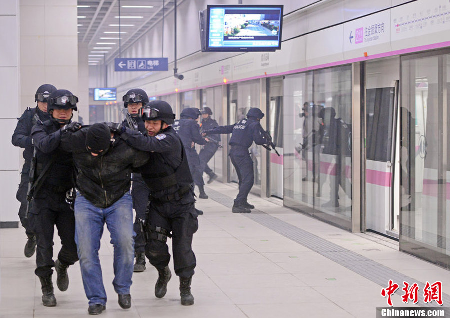 12月16日,湖北武汉,武汉地铁2号线开通前首次进行反恐演习。8名武装恐怖分子在地铁站内“劫持”47名人质,要挟政府释放被警方抓获的犯罪同伙。谈判破裂后,8个突击小组同时向8名恐怖分子发起“攻击”,当场“击毙”5名、生擒3名。这场演练共调动了900多人参加。图为特警将恐怖分子生擒。李溪 摄 图片来源:CFP视觉中国