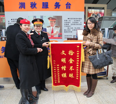 12月11日上午,家住涿州的苏小姐将一面写有“拾金不昧 文明楷模”八个镏金大字的锦旗送到北京南站润秋服务组王欢的手上。