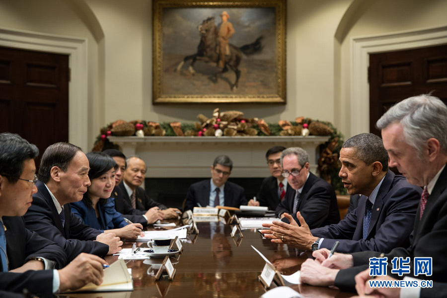 当地时间12月20日,国务院副总理王岐山在白宫罗斯福厅会晤美国总统国家安全事务助理多尼伦时,美国总统奥巴马礼节性会见王岐山。 新华社发