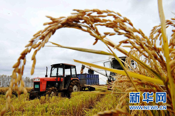 资料图片:2012年10月13日,收割机在黑龙江省八五六农场的稻田里作业。 新华社记者 王建威 摄