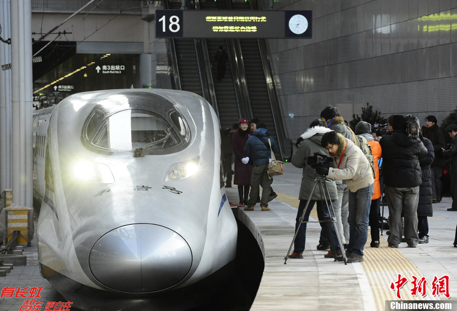 12月22日,中国铁道部向中外媒体记者开放京广高铁北京至郑州段体验采访,图为列车出发前,大量媒体在北京西站拍摄。京广高铁线路全长2298公里,北起北京,经石家庄、郑州、武汉、长沙,南至广州,全线设计速度350公里/小时,初期运营速度300公里/小时。京广高铁将于2012年12月26日正式开通运营,是世界上最长的高速铁路线路。中新社发 侯宇 摄
