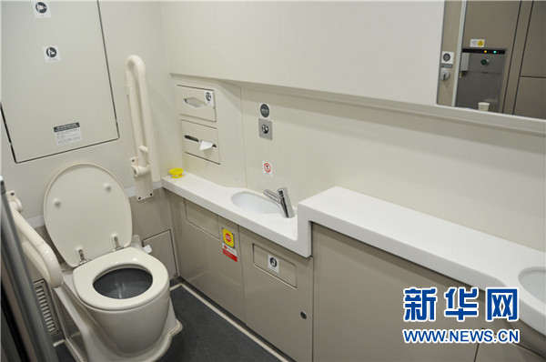 图为残疾人卫生间。残疾人卫生间没有门把手,残疾旅客只需要用手按感应按钮便可开门,卫生间内坐便马桶较普通列车马桶位置偏低,更好的方便残疾旅客。新华网 黄玥 摄