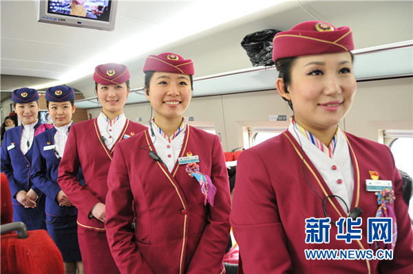 图为京广高铁漂亮的“高姐”,穿红色衣服的为乘服员,穿紫色衣服的餐服员。一趟16节车厢的列车乘服员和餐服员的人数为“一长五”,即一位列车长,五位服务人员。据了解,“高姐”平均年龄23岁,身高165米以上,大专文化水平,相貌较好。黄玥 摄