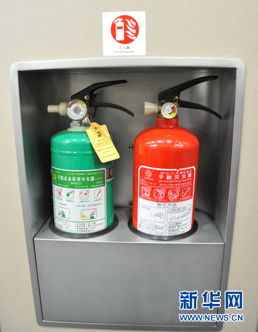图为G83次列车每节车厢两端都配备了两种型号的灭火器,分别为手提式水基型灭火器和手提式干粉式灭火器。黄玥 摄