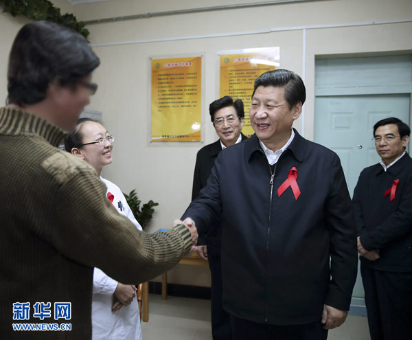 这是2012年11月,习近平到北京市丰台区蒲黄榆社区卫生服务中心参加世界艾滋病日活动,同艾滋病感染者握手、交谈。新华社记者兰红光摄
