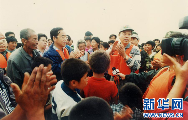 1998年8月20日,张德江乘冲锋舟到吉林省镇赉县嘎什根乡看望被洪水围困的群众,指导抗洪救灾工作。 新华社发