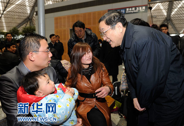 2010年2月11日,俞正声在铁路上海南站视察春运保障工作,并向返乡旅客祝贺新春。新华社发