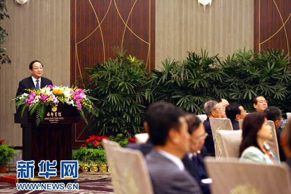 2008年12月20日,俞正声在上海西郊宾馆宴请出席第四届两岸经贸文化论坛的中国国民党主席吴伯雄、荣誉主席连战等嘉宾。这是俞正声在宴会上致辞。新华社记者 刘颖 摄