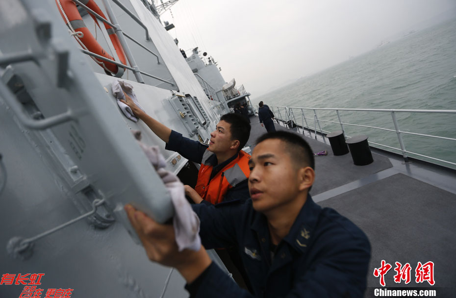 12月25日,中国自行设计建造的第一艘具有编队指挥功能的新型导弹驱逐舰“深圳舰”,抵达深圳,向公众开放。2008年,“深圳舰”首次赴深圳,出席“战舰与城市”论坛。12月26日是中国海军护航四周年纪念日,4艘执行过亚丁湾、索马里海域护航任务的舰艇,将赴命名城市举行舰艇开放日活动。其中“深圳舰”执行的是第二批护航任务。图为舰员擦拭舰艇,为开放日做准备。中新社发 杜洋 摄