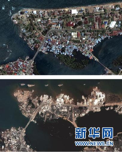 这张2004年12月30日发布的卫星图片显示的是,印度尼西亚亚齐省首府班达亚齐海滨地区受海啸袭击前后的情形。其中,上图拍摄于2004年6月23日,下图拍摄于2004年12月28日。 新华社发