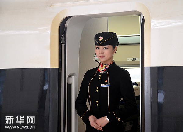 12月22日,G55002次动车组停靠在安阳东站,一位乘务员在车厢门口迎接乘客。