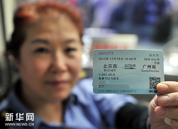 12月20日,北京西站售票员展示26日北京西至广州南的高铁票。当日上午10点,京广高铁动车车票正式发售,可预售12月26日至31日期间的车票。 新华社记者 李文摄