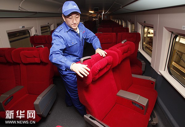 12月25日,北京动车段北京西动车运用所,地勤机械师在对车上座椅进行检查。这辆车号为CRH380A-6120L的动车组将运行明天从北京西站开出的G801次首列京广高铁。